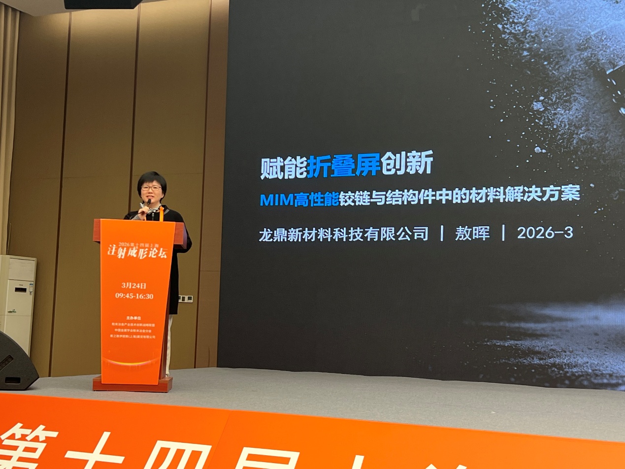 在第十四屆上海注射成形論壇上,龍鼎粉末的敖博士發表了題為《賦能折疊屏創新:MIM 高性能鉸鏈與結構件中的材料解決方案》的主題演講,深度拆解了 MIM 技術在折疊屏核心部件中的應用價值。