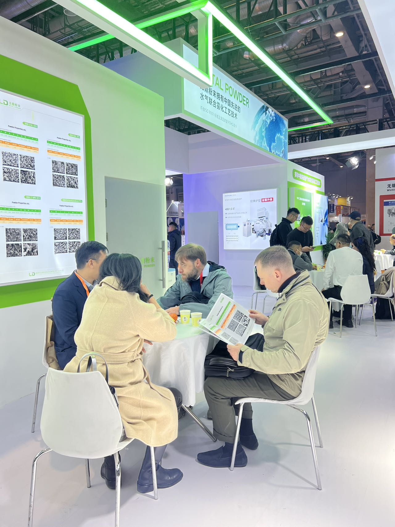 展位內設置了多輪商務洽談環節,客戶與技術團隊圍坐交流,圍繞 MIM 粉末的選型、工藝優化、量產適配等核心問題展開深入探討,現場合作意向滿滿。