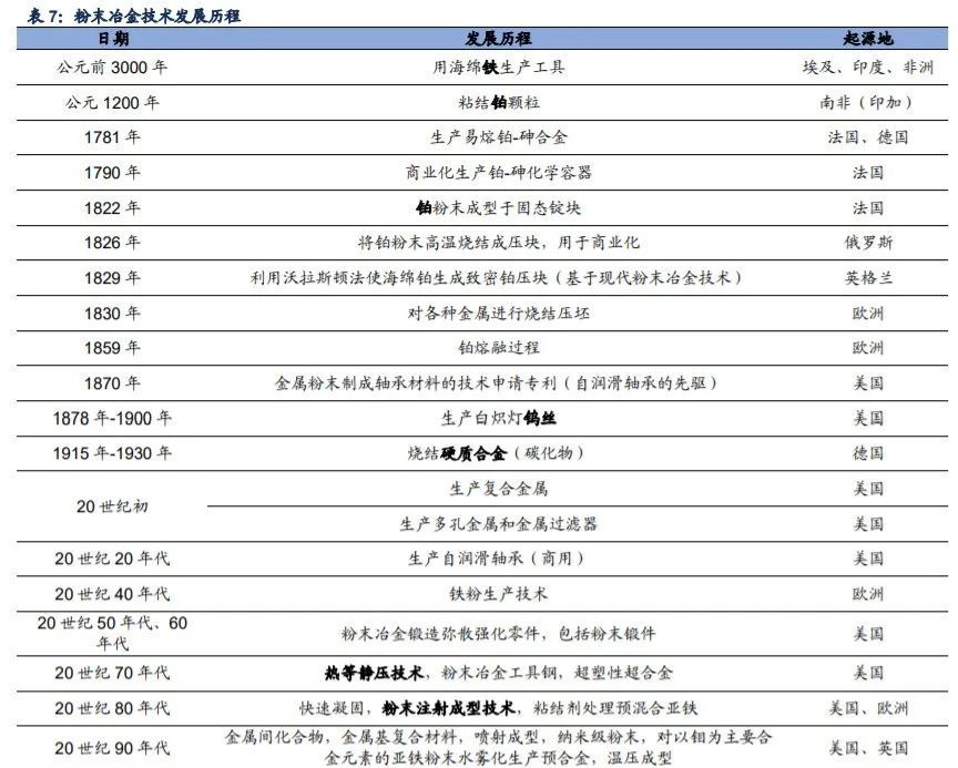 粉末冶金作為一種既古老又充滿活力的先進材料制備和成形技術,起源于古代陶瓷制備 技術和煉鐵技術,為人類社會的發展做出了重要貢獻。據《粉末冶金原理》,18世紀中葉,粉末冶金制鉑技術在歐洲的興起,開啟了古老粉末冶金技術的復興時代。直至1909年,粉末冶金法延性鎢的問世標志著近現代粉末冶金時代的來臨。隨著技術的發展和產品需求的提高,20世紀70 年代粉末注射成型工藝出現,20世紀90年代末金屬增材制造技術得以研究和發展,粉末冶金技術的飛速發展為整個工業界帶來了巨大的變革。100多年來,粉末冶金技術蓬勃發展,各種重要新型材料和關鍵性制品不斷涌現, 成為當今國民經濟和科學技術不可或缺的重要工程技術之一。