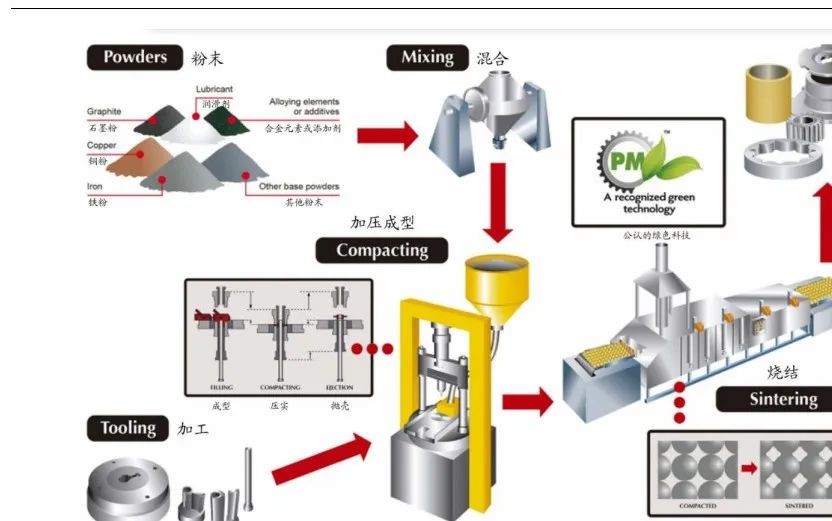 粉末冶金是最先進的金屬成形工藝粉末冶金技術是將金屬粉末制成復合材料以及各種類型制品的核心技術工藝,其將金屬 粉末或者復合粉末作為原材料,經過成型和燒結等工藝加工成金屬制品。作為一門新興的材料制備技術,粉末冶金技術能耗低,具備近凈成型的優勢,材料利用率高達95%, 是最先進的金屬成形工藝。